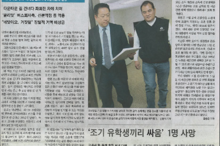 교통사고 불체자, 700만달러 소송 이겼다 <버스회사 상대> 48세 배인식씨, 이제영 변호사와 2년여만에 결실 Bold: 다운타운 길 건너다 좌회전 차에 치여 ‘골리앗’ 버스회사측, 신분약점 등 악용 “네탓이오, 거짓말” 징벌적 거액 배상금   다윗이 골리앗을 때려눕혔다. 40대 한인이 대형 버스회사를 상대로 법정 소송을 벌여 700만 달러의 배상금을 받았다. 교통사고를 당한 배인식(48)씨는 버스회사 ‘퍼스트 트랜짓’과 2년여 간의 치열한…